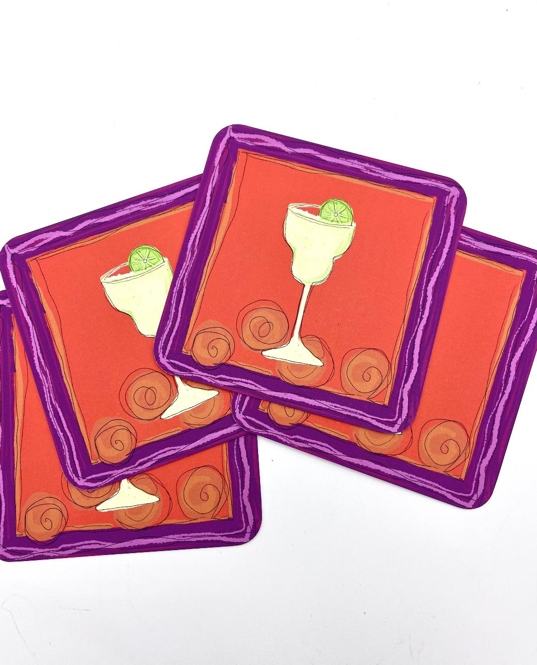 Set of 4 printed durable paperboard coasters by E. Drumm Designs. Good for several uses.